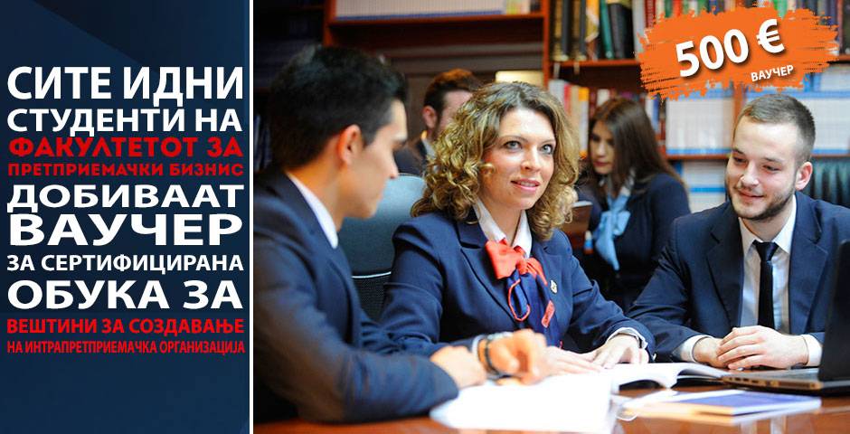 The Faculty of Entrepreneurial Business within the enrollment deadlines in the academic year 2017-2018, for the newly enrolled students in the first year awards a voucher of 500 EU for Certified Training for Skills for Creating an Interpreting Organization. The training is in function of acquiring applicable knowledge for creating an intra-acceptor organization. The methodology of the training is interactive and simulates real business situations of good practice through which the students will learn which tools are used in managing a proactive organization. The training will enable to the students of UTMS to acquire competitive skills and competencies.