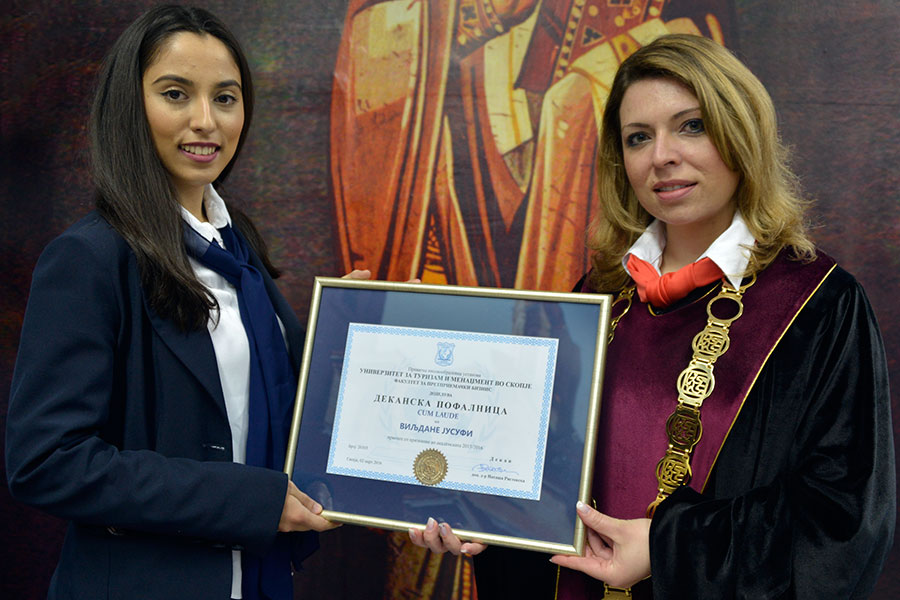 Dean of the Faculty of entrepreneurial business, Natasha Ristovska doc. D-r. gave appreciative to the student Viljdane Jusufi in third year in the category Cum Laude and the student Mario Stojkoski in the first year in the category Cum Laude